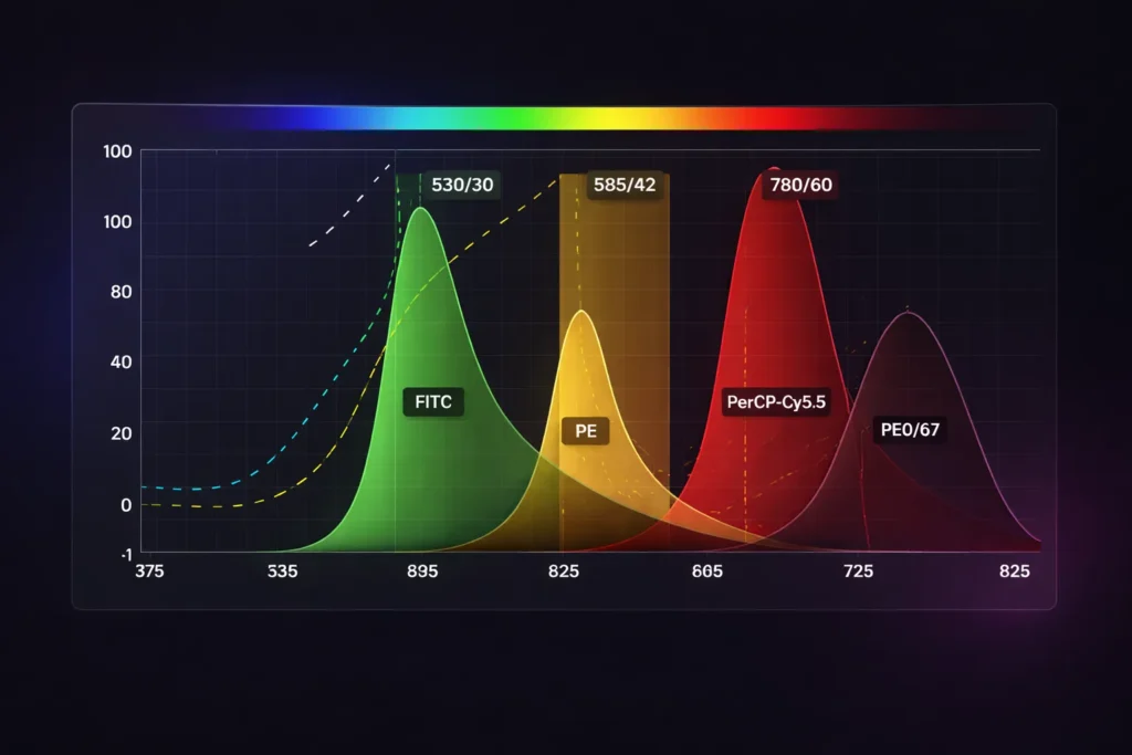 Fluorescence excitation and emission spectra can be complex with highly convoluted absorbances. Often a simple multiple-Gaussian model suffices to capture the principal excitation and emission wavelengths.