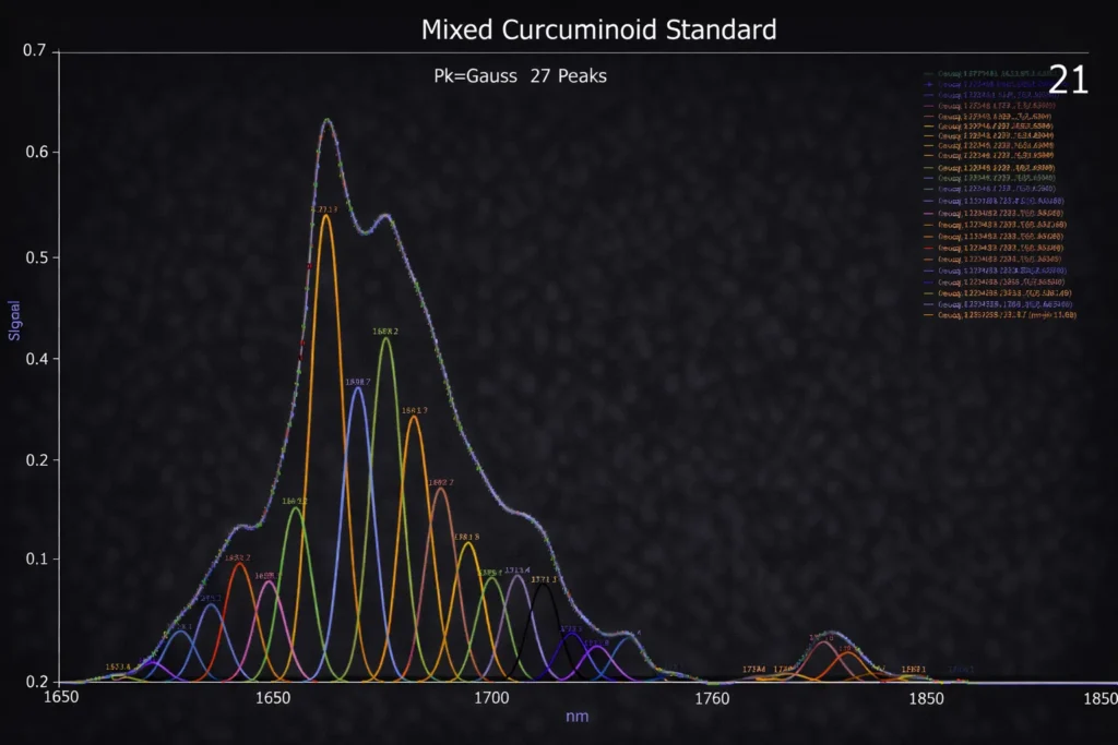Before building a predictive model, it is useful to fit the spectroscopy for the known target analyte(s) with a set of equal width Gaussian or Voigt peaks. This will furnish two essential pieces of information for the predictive modeling. The optimal fit will determine the spectral resolution of the instrument, and this will be used for setting the x-spacing for the wavelengths in the predictive model. The fitting will also estimate the wavelengths that should appear as the principal predictors in the chemometric models. In the reference standards example below, there are four principal peaks, all at adjacent wavelengths, and the optimal multiple Gaussian fit estimates an SD width of about 4 nm, a reasonable value for high resolution FTNIR spectra.