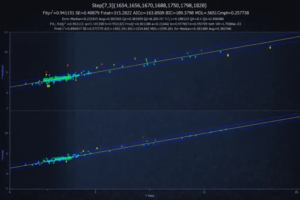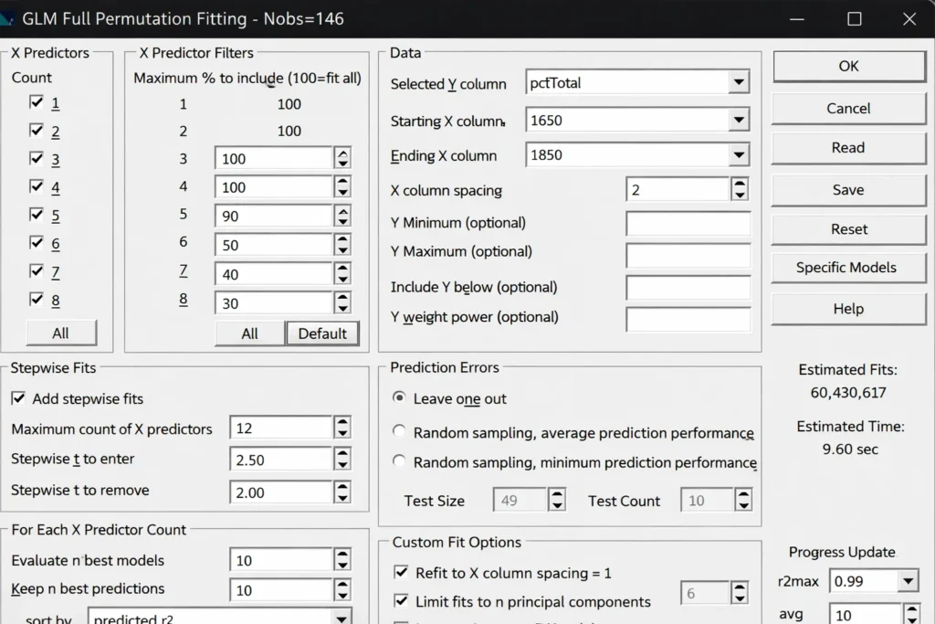 Unlike complex chemometric modeling programs, PeakLab presents the whole of the modeling settings in one dialog where most options can be left at the defaults. Simply select the variable in the data matrix that is to be modeled, the range of the wavelengths you want to use, and use filters, if needed, to produce a reasonable modeling time. In this example, 60 million candidate models will be fit in about 10 seconds. PeakLab’s higher parameter count filters make impractical full permutation fits viable. The fit in the example below would require close to 12 hours and the fitting of 220 billion models without these smart filters that intelligently remove unproductive predictors as the fitting algorithm proceeds.