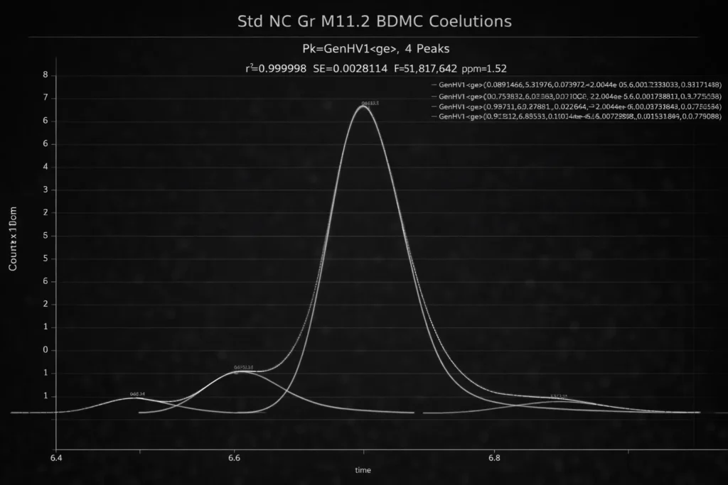 The above separation represents an optimal separation of the BDMC region in a curcuminoid analysis. In most published studies, only a single peak is seen at this location. In this optimized separation, there are three additional components and little prospect for realizing baseline resolved peaks, gradient or isocratic. Despite sharing the tailing-fronting factor and third moment asymmetry across all four peaks, the peak fit above produced an unaccounted variance error of just 1.52 ppm, and accurate estimates of the areas of the four components. PeakLab was also able to process the 3D DAD data to extract and confirm different UV-VIS curcuminoid spectra for the four components. For chromatographic researchers where baseline resolved peaks are not always an option, PeakLab is an indispensable analytical tool.