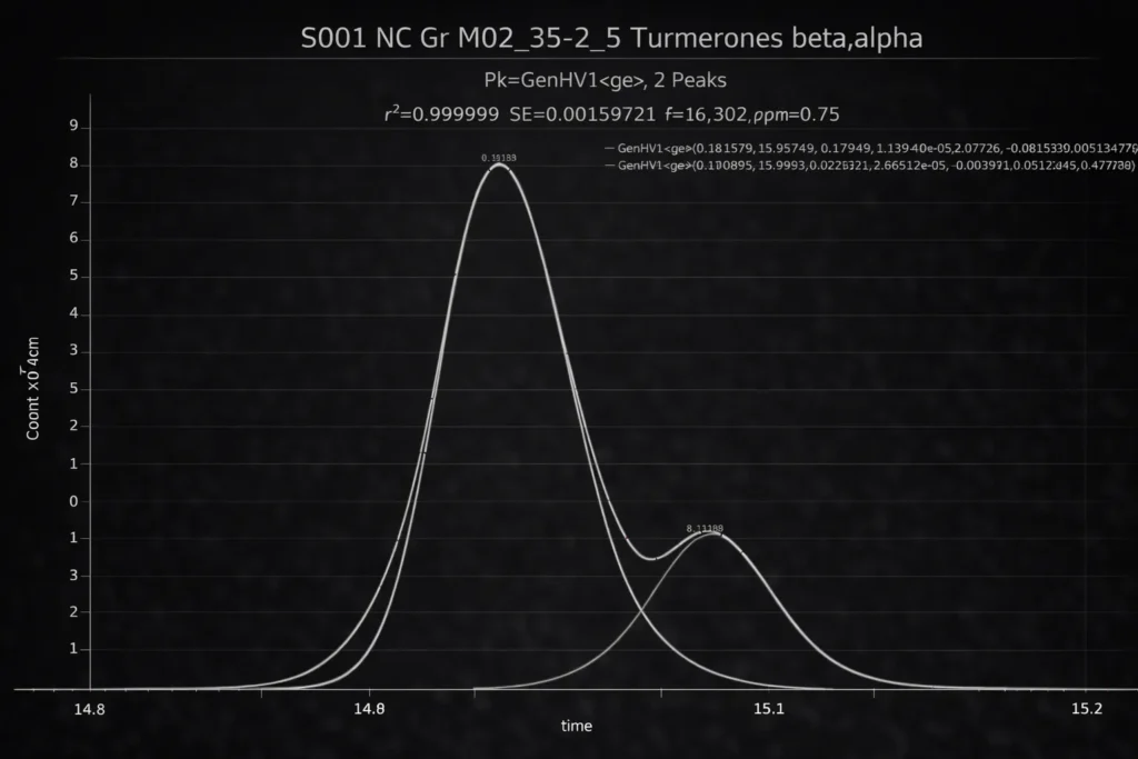 The above gradient peaks consist of near coeluting beta and alpha turmerones. A twice-generalized HVL model with third and fourth moment adjustments and also fitting the non-cancelled portion of the IRF produces a 0.75 ppm unaccounted variance goodness of fit. The modeling was able to fit the peaks to an accuracy which would match that seen with integrating baseline-resolved peaks.