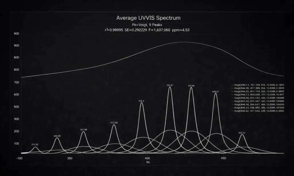 In the above optimum UV-VIS fit, a nine-Voigt model fits the data with a variance error of just 4.5 ppm and an F-statistic of 1.6 million. The deconvolved Lorentzian spectral peaks are those that would be seen in a perfect instrument with no signal smearing from the Gaussian instrument response function, shown in red for each peak. An optimized Voigt fit such as this reveals the principal wavelengths that will be seen by an effective chemometric modeling system.