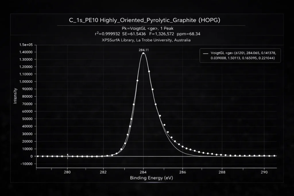 XPS and Raman spectral peaks generally have an intrinsic asymmetry that can be effectively fit with Voigt models containing instrument response functions.