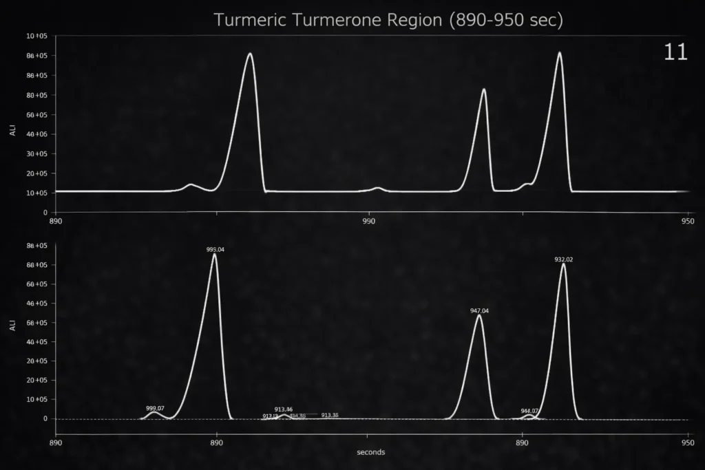 Gradient UHPLC and HPLC separations add one more tier of complexity to the peak shape. While a third moment adjustment of the underlying density is generally needed for isocratic analytic peaks, gradient peaks require both third and fourth moment adjustments for truly effective modeling as well as an estimate of the aggregate gradient that is present during the analyte’s overall transit through the column. While a well-crafted gradient can sometimes cancel most of the tailing of the IRF, the compressed shape of a gradient peak still requires this additional fourth moment level of modeling with respect to peak shape. Further, simply because a gradient can cancel much of an IRF, doesn’t mean that this will occur for even a single peak, and it will definitely not occur for peaks which partially or fully transit during an isocratic hold. The IRF will also still be present if a slower gradient is used or if the flow path has a strong IRF that cannot be fully offset by the gradient. The above gradient peaks consist of near coeluting beta and alpha turmerones. A twice-generalized HVL model with third and fourth moment adjustments and also fitting the non-cancelled portion of the IRF produces a 0.75 ppm unaccounted variance goodness of fit. The modeling was able to fit the peaks to an accuracy which would match that seen with integrating baseline-resolved peaks.