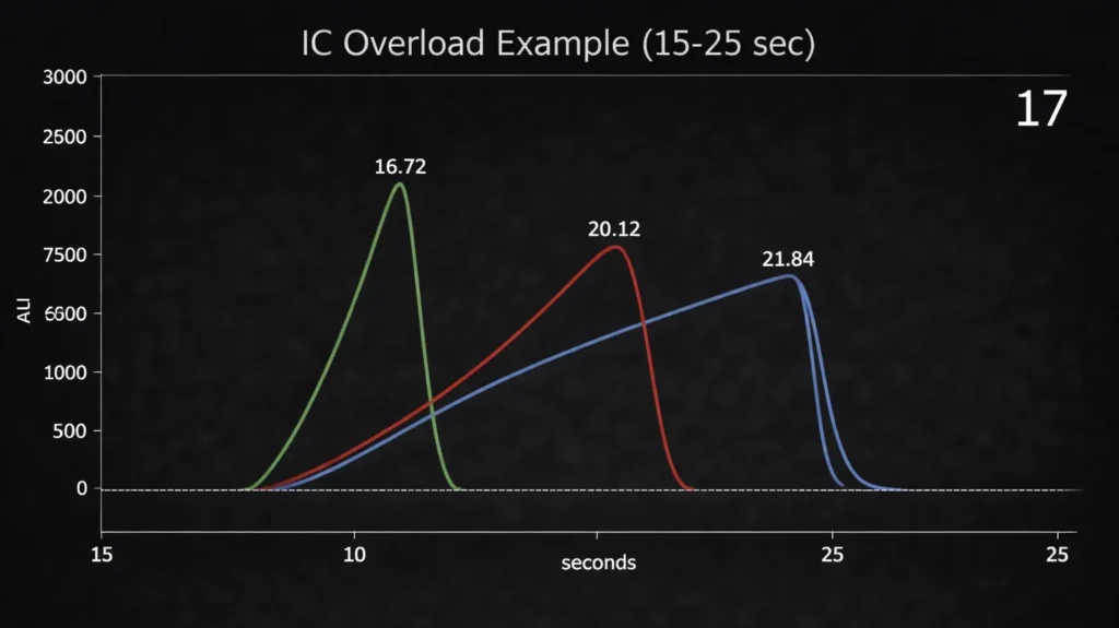 In the above IC preparative separation, the overload state within the column is apparent. The blue curve is the peak as registered by the instrument, the red curve is the peak that would be seen if there were no instrumental distortions, and the green curve is the pure HVL that would be seen if there were no higher moment nonidealities and if the column’s capacity had been such no overload occurred. For the peak as registered by the instrument, the blue curve, the N by the Gaussian FWHM was 125, and the N by moments was 150. For the parametric model where the overload state was deconvolved, the green curve, the separation that would be seen in the column had infinite capacity, N=6518, essentially the value one would expect to see in an analytic separation.