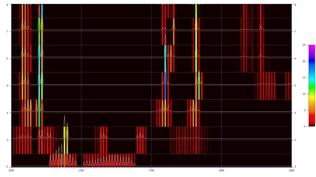 In direct spectral fits, far better estimates of significant wavelengths are realized. These tend to be much less influenced by secondary and inverse correlations or other artifacts arising from generating factor arrays. In the significance plot below, the contour reflects the weighted statistical significance for each wavelength that appears within the retained (best fit) models. At a certain parameter count and beyond, the significant wavelengths become sharply defined.